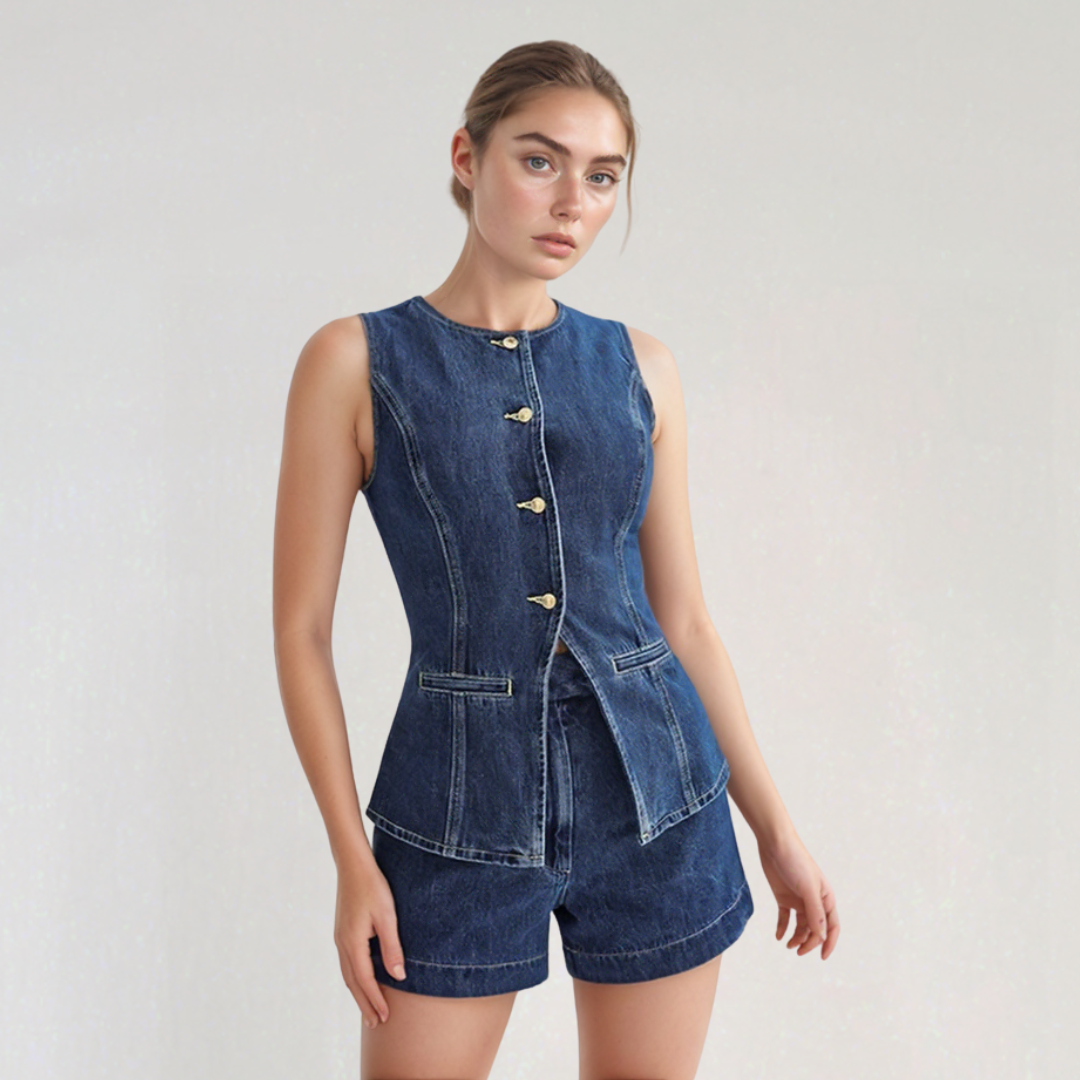 Este conjunto incluye un chaleco sin mangas estructurado con botones dorados y bolsillos delanteros. El pantalón corto de cintura alta ofrece un corte favorecedor y una comodidad óptima.
