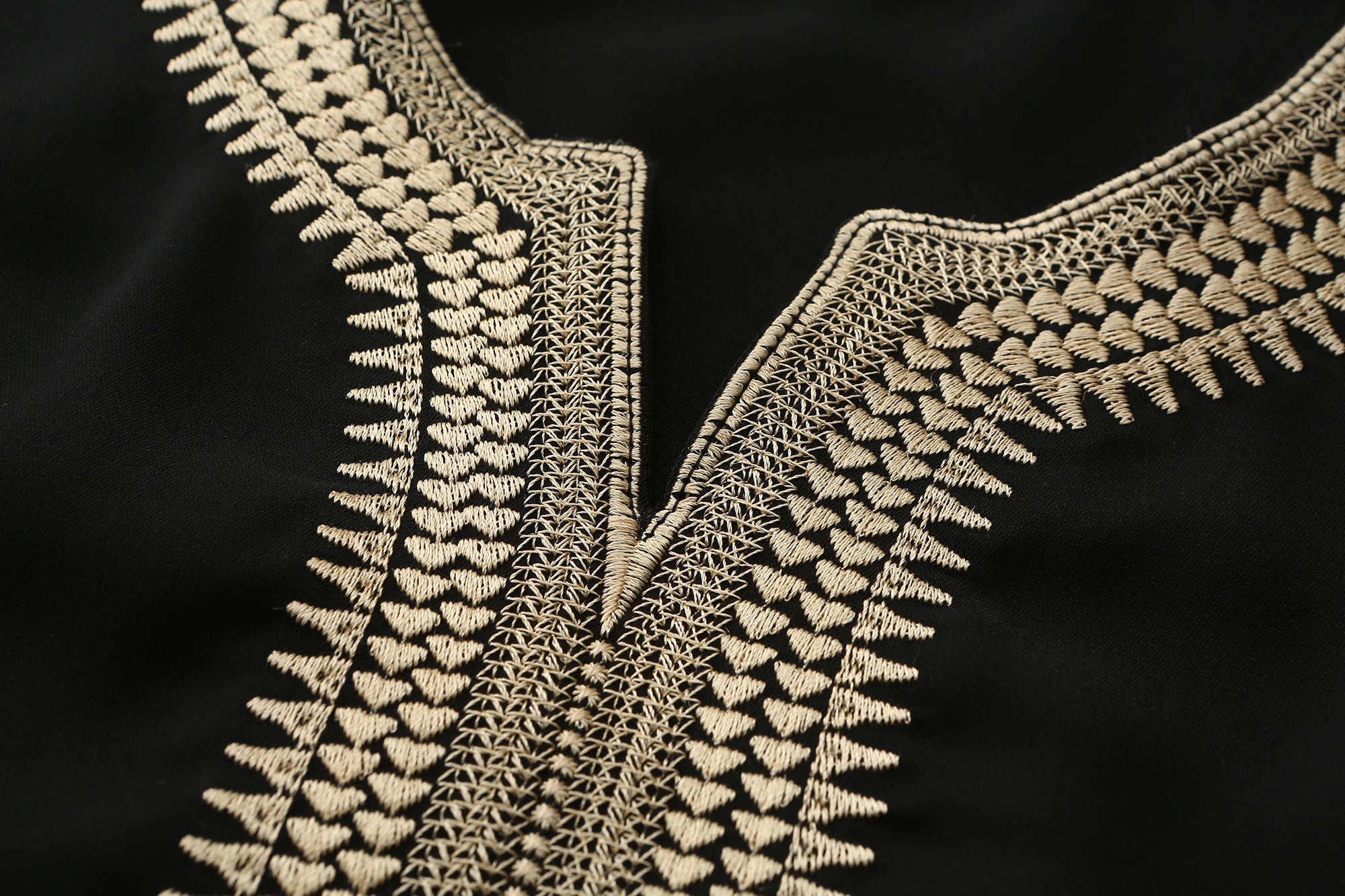 Tento černý thobe v marockém stylu se vyznačuje pečlivými zlatými výšivkami a majestátním vzhledem. Jeho volný střih zajišťuje velkou svobodu pohybu, přičemž si zachovává elegantní siluetu. Ideální pro oslavy, modlitby nebo formální výlety.