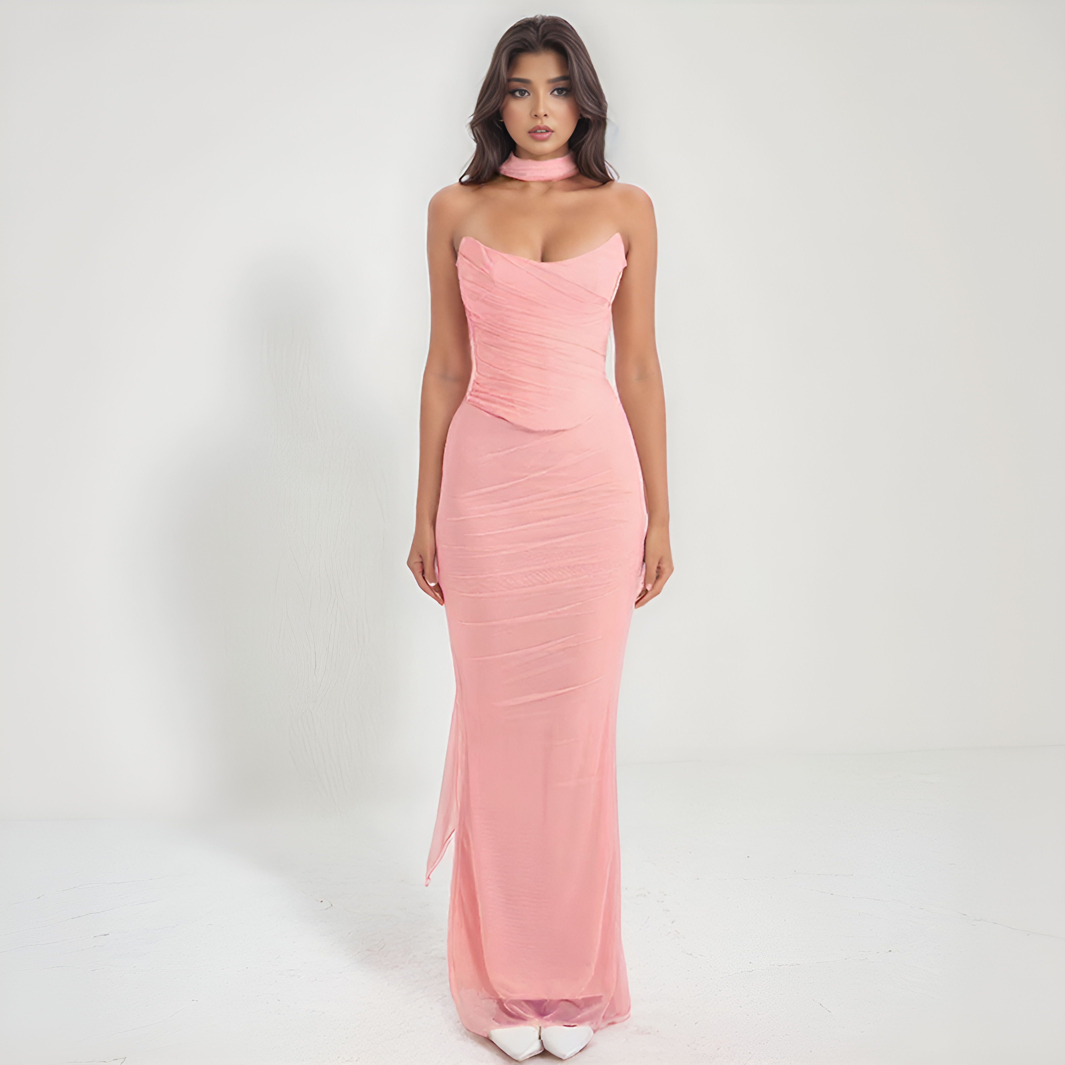 Perry | Dlouhá Šaty Dva Kusy – Elegantní Bez Ramínek A Koordinovaný Šátek