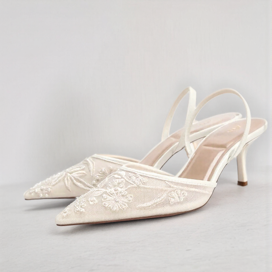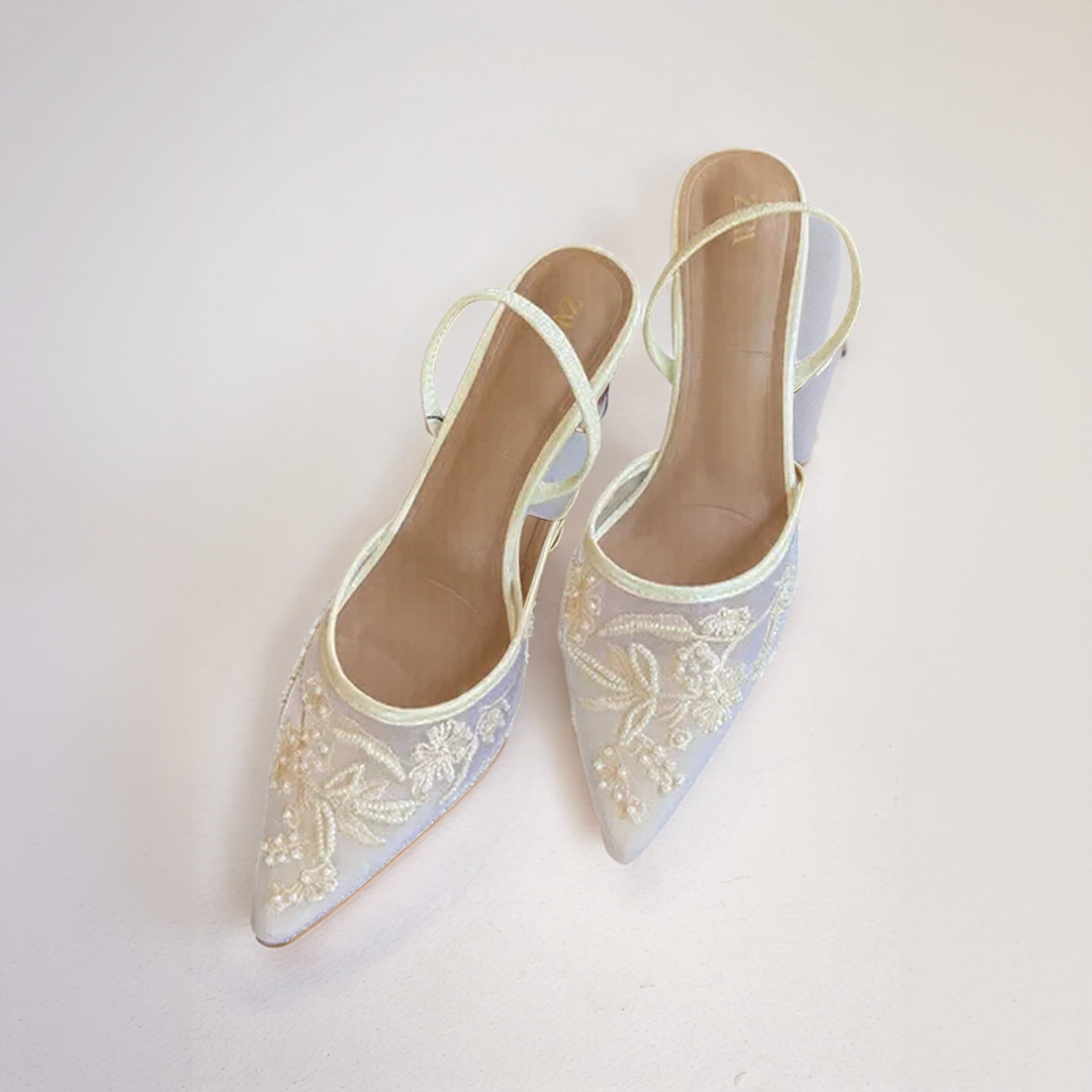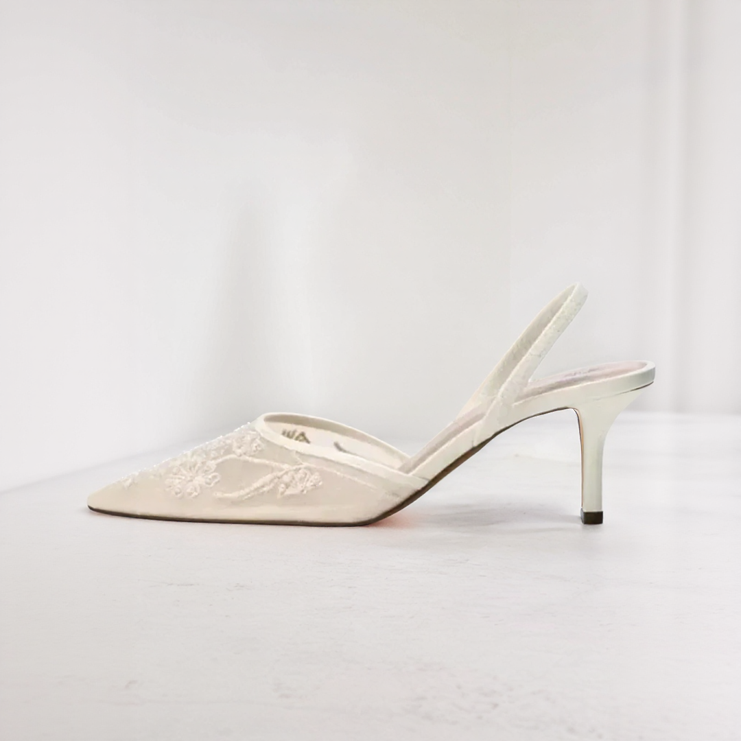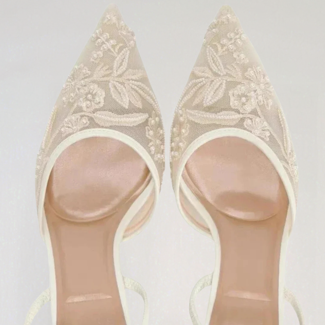 Disse højhælede sko skiller sig ud med en fin blomsterbroderi på en let og gennemsigtig overdel. Deres spidse tå strækker silhuetten med elegance, mens den justerbare rem sikrer en sikker pasform samtidig med at den tilføjer et strejf af raffinement.