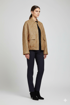 Denne korte guldjakke tilføjer straks et lyst touch til dit outfit. Dens moderne snit og subtile glans gør den ideel til aftener eller særlige lejligheder. Let at kombinere, den forener komfort, stil og raffinement.