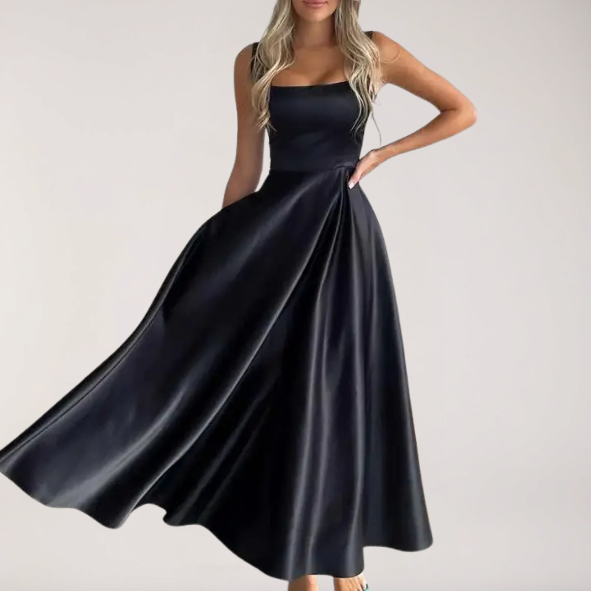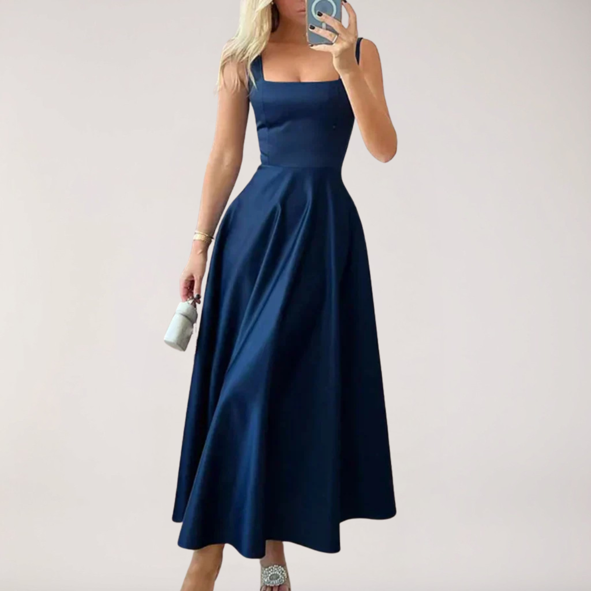 Dieses Midikleid hat eine strukturierte Silhouette mit einem schmeichelhaften quadratischen Ausschnitt. Der fließende A-Linien-Schnitt bietet eine raffinierte Eleganz für formelle Veranstaltungen.