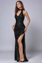 Αυτή η μακριά βραδινή φόρεμα μαγεύει με τις λαμπερές πούλιες και την τολμηρή ψηλή σχισμή της. Ο διαμορφωμένος V λαιμός της και η στενή γραμμή της αναδεικνύουν τη σιλουέτα με κομψότητα. Ένα γοητευτικό κομμάτι σχεδιασμένο για να λάμπει σε όλες τις εξαιρετικές βραδιές σας.