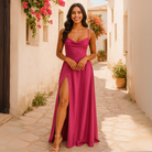 Αυτό το μακρύ φόρεμα χωρίς μανίκια ενσωματώνει τη θηλυκότητα με κομψότητα. Η γραμμή του αναδεικνύει τους ώμους, ενώ η ρευστή φούστα με σκίσιμο συνοδεύει κάθε κίνηση με κομψότητα. Μαλακό στην αφή και ευχάριστο στη χρήση, είναι κατάλληλο τόσο για επίσημες βραδιές όσο και για πιο χαλαρές στιγμές.