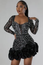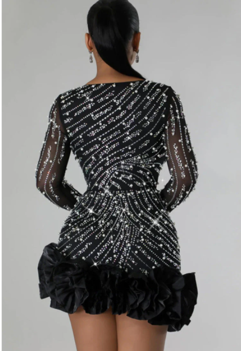 Tämä tiukka mini-mekko on koristeltu kimaltelevilla kristalleilla. Sen syvä V-pääntie ja pitkät, istuvat hihat tarjoavat hienostuneen siluetin. Täydellinen iltoihin ja erityisiin tilaisuuksiin.