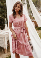 Cette robe à rayures verticales séduit par sa coupe fluide et son design épuré. Son col en V et ses manches courtes ajoutent une note féminine. Idéale pour les journées d’été ou les soirées en toute simplicité.