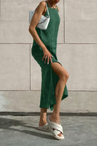 השמלה הארוכה הזאת מקסימה בסגנון המינימליסטי שלה ובנפילה הרכה שלה שמדגישה את הסילואטה באופן טבעי. החיתוך הנקי והחריצים הצדדיים הדיסקרטיים הופכים אותה ליצירה מושלמת לשילוב נוחות ועידון. קלה ונעימה ללבישה, היא מתאימה גם לימים שטופי שמש וגם לרגעי רגיעה בחופשה.