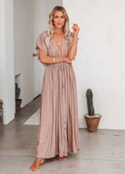 Ez a hosszú, légies ruha elegáns és laza sziluettet kínál. Mély dekoltázsa kiemeli a sziluettet. Tökéletes napos napokra vagy nyári estékre.