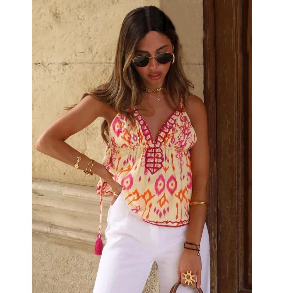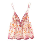 Ez a ujjatlan blúz lenyűgöz az azték művészet inspirálta mintájával és élénk színeivel. Könnyed és folyékony, tökéletes napos napokra, ötvözve a kényelmet és a laza stílust.