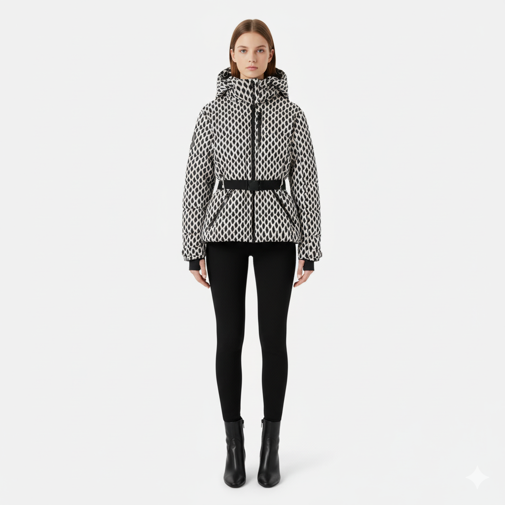 Denne vinterjakken kombinerer komfort og sofistikert design med sin unike grafiske stil og figursydde snitt. Den elegante belte fremhever silhuetten samtidig som den gir optimal beskyttelse mot kulden. En chic og moderne modell, perfekt for å møte vintersesongen med stil.