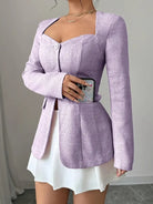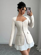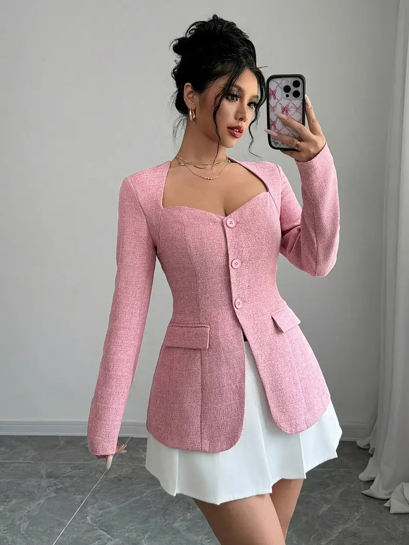 Deze knoopjas accentueert de silhouette met zijn getailleerde snit en moderne vierkante halslijn. Perfect voor een elegante en vrouwelijke uitstraling, hij is zowel geschikt voor op kantoor als voor een avondje uit. Het verzorgde ontwerp en de delicate knopen voegen een tijdloze verfijning toe aan uw outfit.