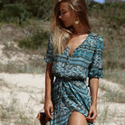 Această rochie lungă are un decolteu în V și mâneci lungi, conturând o siluetă fluidă și feminină. Imprimarea sa colorată, inspirată de cultura aztecă, aduce o notă de originalitate, rămânând în același timp delicată. Ideală pentru o ceremonie, îmbină confortul și rafinamentul la perfecție.