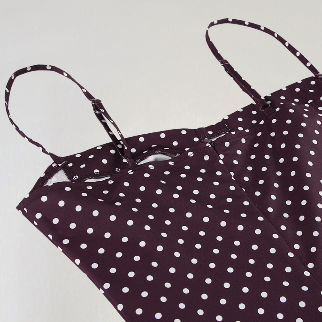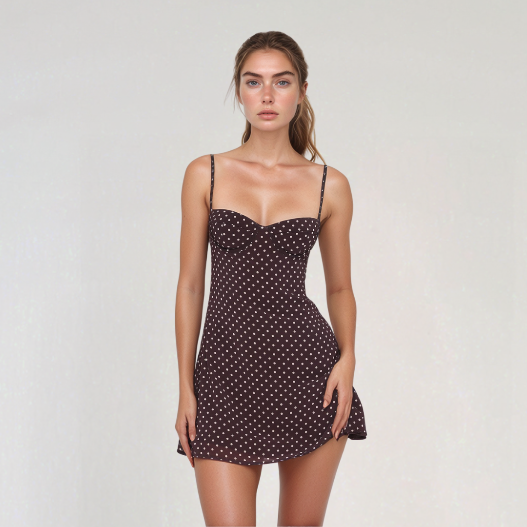 Această rochie scurtă seduce prin croiala sa feminină, bretelele fine și decolteul în formă de inimă. Motivul cu buline pe fond de ciocolată îi conferă un aspect retro și elegant. Ideală pentru a străluci în zilele însorite sau în serile de vară.
