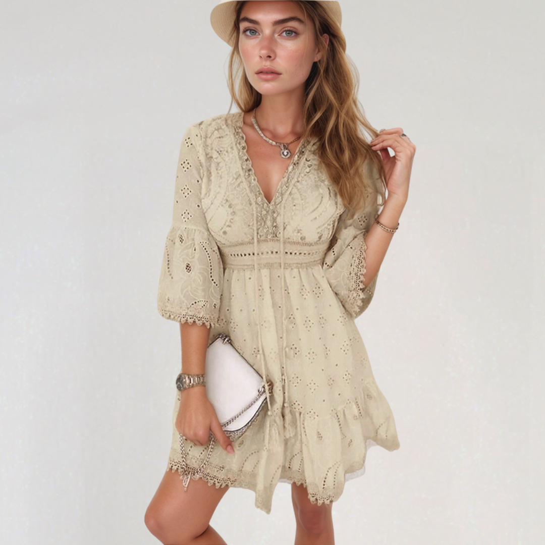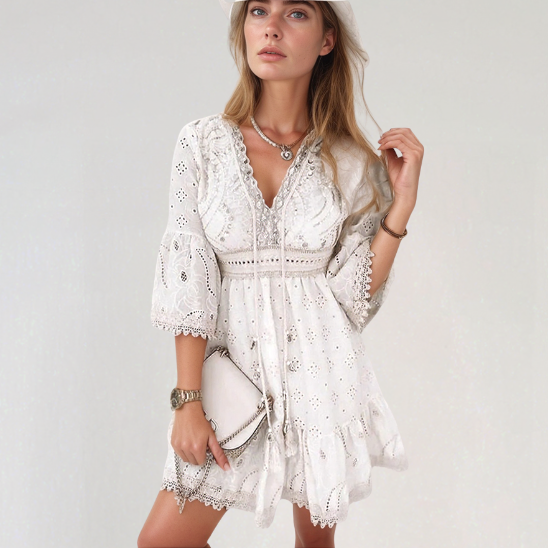 Ghislaine | Krátka Bohémka Šaty – Jemné Výšivky a Golier V