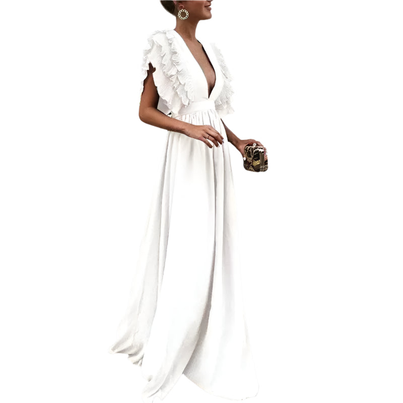 VARFÖR VÄLJA DEN LÅNGA ELEGANTA KLÄNNINGEN MED VOLANGER OCH DJUP URRINGNING?
